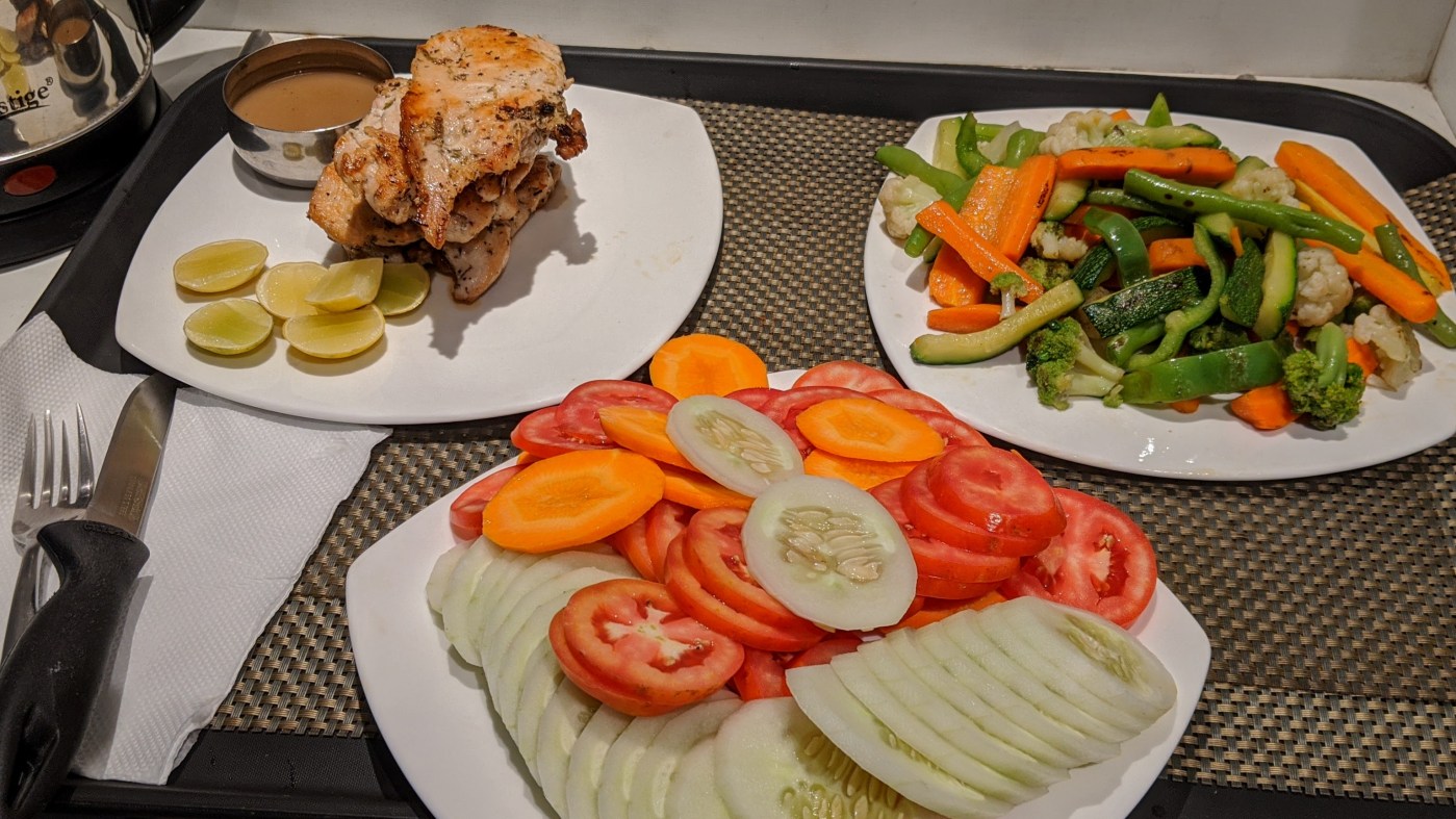 - Empecé después de mi cena del domingo, que fue básicamente la misma comida el martes en la noche: pollo, verduras y una fruta.