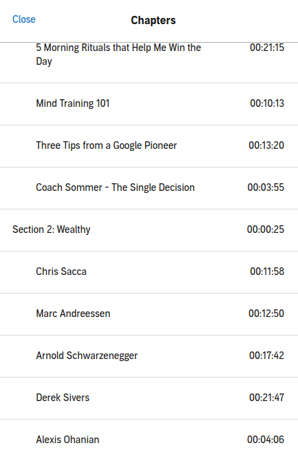 El audio libro viene precisamente indexado casi con OCD levels, cada capítulo es uno de estos personajes, en promedio van durando como 5 minutos, algunos duran un poco mas pero no mas de 20 minutos en cada individuo, lo que hace que sea bastante sencillo regresar en cualquier momento a revisar las recomendaciones o herramientas – duh, por eso se llama Tools of Titans – cero bronca con el indexado, incluso viene el clásico PDF de companion, con algunas paginas donde vienen diagramas o imágenes de ciertos ejercicios así como un índice de los libros y documentales que son recomendados por los entrevistados.