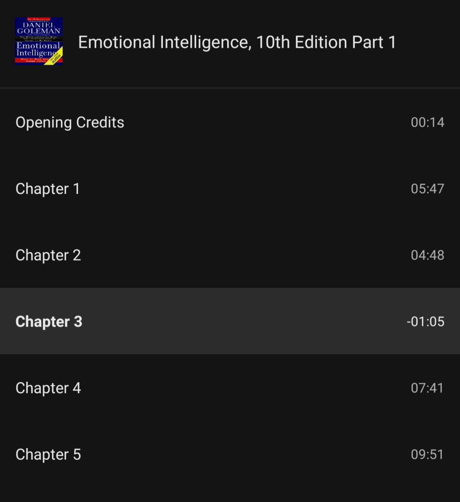 El contenido es bueno, pero el formato es malo, a este titulo en particular le voy a poner un 2/5 ⭐⭐, sobre todo por la musiquita y el indexado insufrible, acá les dejo la liga por si se lo quieren escuchar en Audible: Emotional Intelligence, 10th Edition.