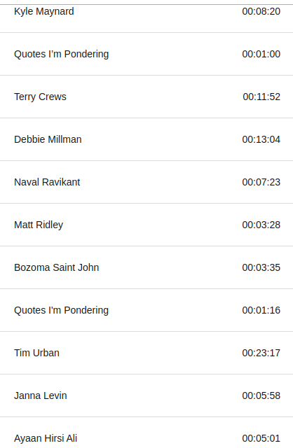 Como estaba mencionando, el hecho de escuchar el podcast y haber leído (escuchado) Tools of Titans, hubo personajes que de plano fueron casi un recalentado de lo que ya se había dicho, y para que no se sintiera como un «copiar-pegar» de su podcast, Tim se avienta unos inters de «frases», esas frases que la gente publica en redes sociales para «reflexionar», aunque mas que eso es para ver que reacción generan en sus seguidores ( se sienten bien los likes), pues Tim se avienta con una serie de esas a lo largo del audio libro, las marca muy bonito con fechas como para denotar como fueron progresivamente siendo añadidas al libro.