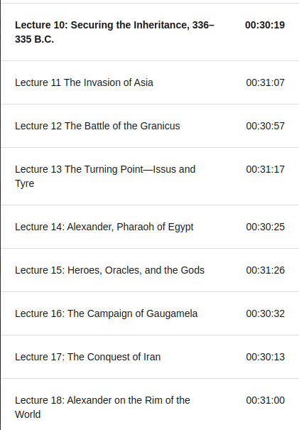 Este más que un audio libro es un curso o una serie de «lecturas» impartidas por Kenneth W. Harl, Ph.D. Un doctor en historia de la universidad de Nueva Orleans y dura al rededor de 18 horas y media, las cuales están divididas en 37 lecturas o clases de media hora donde el profe Kenneth nos habla no solo de la vida de Alejandro Magno, si no también del panorama que heredo de su padre Filipo II, de como llegó este a conquistar una gran porción de territorio, la histórica rivalidad con Dario (todos los Darios y Xerxes, que ni al caso con el vato pelón en 300) y el imperio Persa, todas las campañas para dominar lo que ellos consideraban el mundo entero, así como aspectos de la vida cotidiana del pueblo macedonio y su impacto al mezclarse con la cultura Griega, Egipcia, Hindú, Balcánica y Persa entre otras, una vista muy completa de la región en ese periodo histórico y el panorama que dejo mi tocayo después de su muerte a los 33 años de edad (carajo, conquistó el maldito mundo con menos de 33 años de vida) con impacto y relevancia incluso hasta nuestros días.