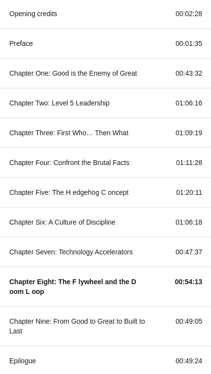 En conclusión claro que lo recomiendo si estas metido en temas de liderazgo o self-developement, si estás o te interesa meterte en la parte de management o tienes la tarea de llevar un grupo a un objetivo, de otro modo, algún tip puedes sacar para tu vida cotidiana pero sería el 20% del libro, en este caso por el tema del indexado y por ser tan nicho le voy a dar ⭐⭐⭐3/5, y como siempre acá esta la liga para que te lo escuches en Audible: Good to Great.