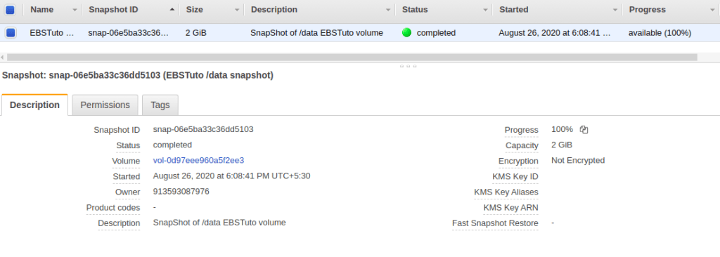 Ve a la sección de volumes en tu consola de AWS y selecciona el volume que quieres migrar de AZ, click derecho y crea un snapshot de el, necesita una breve descripción, yo le puse un tag para identificarlo con un un Name.
