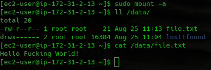 Cuando acabes con el proceso y hayas montado el FS en el device correcto, nuestro amigable archivo estará ahí para transmitirte su glorioso mensaje… pero esta vez desde otro volume, y desde otra AZ.