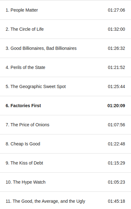 Es un audio libro interesante, te muestra desde el análisis del autor a entender por que nos va como nos va y en teoría como deberíamos o podríamos hacerle para que nos fuera mejor de una manera simplificada sin caer en lo simplista, claro desde una perspectiva completamente capitalista y de libre mercado, le voy a poner un ⭐⭐⭐3/5 por el tema del indexado y de la forma que esta estructurada la info, que es un poquito compleja de seguir.