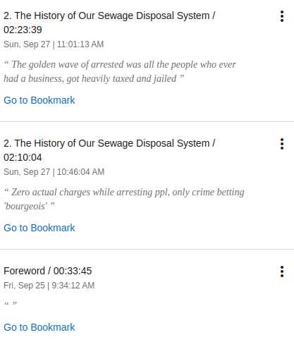 El libro es complicado por que a veces no sigue una progresión lineal, debido a la forma en la que fue escrito, de pronto salta a historias de otras personas, o perspectivas enriquecidas por documentos de la época y demás, así que si es algo demandante del oyente/lector, y por otro lado, hay capítulos que completamente están fuera por ser de carácter personal del autor, algo que explican en la introducción, aunque de todos modos honestamente no entendí por que omitirlos, así que de pronto te topas con que «el siguiente capitulo tenía cuestiones personales del autor» y simplemente no está.