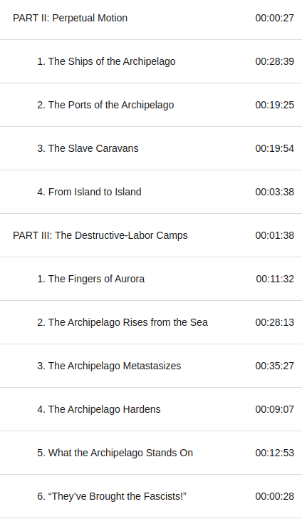 La estructura del libro original son 7 partes, y el audio libro tiene eso, con una serie de subcapítulos, el indexado es exquisito, puede uno irse a algún tema en particular, y como los capítulos están mas o menos desacoplados no afectaría mucho en mi opinión cambiar el orden de los subcapítulos en ese contexto, en total este audio libro dura 23 horas y media contando el podcast al final y la introducción, una cosa que se me hizo complicada fue darle sentido a ciertas historias en el contexto de los personajes que las vivieron, según Solzhenitsyn todos los lugares y personas son reales, no se cambio la identidad de nadie ni nada, entonces esta medio complicado hilar las historias con algunos de los apellidos o localidades rusas para mejorar el contexto y situar las historias, algo que tuve que hacer mas de una vez fue checar mapas para ver donde estaba tal o cual campo o ciudad, lo que lo volvió mas interesante pero también mas demandante.