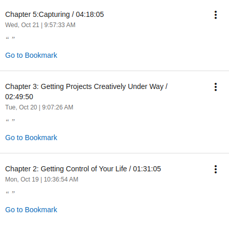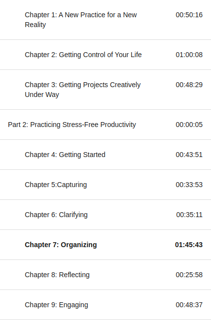 En cuanto al audio libro, es una lectura ligera de esas de diez horas y media, narrado por el autor, el cuál le echa ganas pero la neta es mucho mejor autor que narrador, si me hizo regresarme varias veces por que me andaba quedando dormido, el David le da vuelo a la hilacha haciendo bien explícitas ciertas características de su método, incluso menciona categorías en las que sugiere organizar los pendientes, el indexado esta bastante bueno ya que esencialmente la metodología de GTD se divide en tres partes, pero estas a su vez se dividen en múltiples capítulos relativamente cortos, de no más de 45 minutos, este fue uno de esos audio libros que voy a tener que comprar impreso para exprimir realmente todos los detalles del método para poderlo emular en las partes que siento podrían sumar a lo que actualmente hago, de entrada hay una bola de tips que me dí cuenta que ya hacía algunos casi al pie de la letra y que estoy de acuerdo que me han ayudado a ser mas productivo, o mínimo mas organizado y estar «encima de mi mierda» (que mal suenan esos anglicismos traducidos literalmente) como algunos trucos manejando el inbox de correo electrónico con múltiples reglas y directorios de seguimiento para otros proyectos y así mantener mi correo limpio, entre otros.