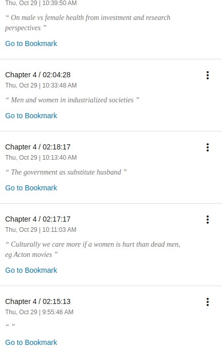 Lo recomiendo para todos, hombre, mujer, o círculos, es un librito en cortito y bastante entretenido, le voy a dar ⭐⭐⭐⭐4/5 nomás por lo del indexado y la voz dormilona de Warren Farrell, como ya te la sabes, acá la liga para que te lo escuches en Audible: The Myth of Male Power.