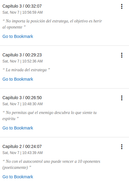 Pasando a lo que me compete en la reseña de este libro: Go Rin no Sho, este en particular no es el primero que escucho, sería el primero en Español, puesto que el texto original es en Japonés, y habiéndolo escuchado previamente en Inglés, no se me hizo una mala idea ahora escucharlo en Español, y creo que sirve, ya que mucho de ese discurso a veces casi poético traducido al Inglés, puede conservar el mismo ímpetu en Español, ademas de que no necesito un esfuerzo extra de mi parte para entender ciertos párrafos, lo cual si fue mas demandante en Inglés, sin embargo la estructura de este audio libro en Español deja un poco que desear, dura casi dos horas, y esta dividido en 9 capítulos, pero el indexado es de esos que no te aportan nada, no esta delimitado el capítulo con los temas o alguno de los 5 libros en especifico, así que volvemos a las bookmarks, el reto con este audio libro fue que Musashi esta «escupiendo» joyita tras joyita y tendría que estar básicamente bookmarkeando casi todo el audio libro, lo cual se simplificaría con escucharlo de nuevo en su totalidad, el narrador hace un trabajo decente, la dicción es buena y el ritmo también, lo mismo entiendes a 1X que a 2X, sin quejas en ese aspecto.