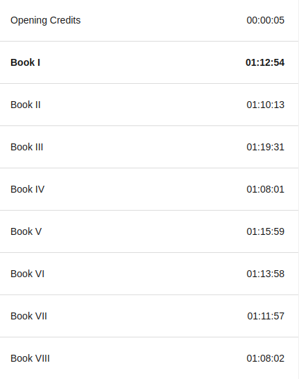 El audio libro en si esta dividido en los diez libros, pero nada mas, sin embargo al ser este un audio libro de poco mas de 11 horas y media, es de esos que están seccionados en varios tomos o archivos, en este caso tres, cada libro dura aproximadamente entre 15 minutos hasta hora y media, uno de los aspectos que mas me gusto de este audio libro fue la narración, la cuál esta a cargo de varios actores, te hace sentir que estas ahí en la casa de Polemarco escuchando toda la conversación, es bastante entretenido y hasta divertido puesto que los actores hacen una muy buena chamba en los momentos en los que el contexto de ciertas oraciones son como de broma incluyendo algunas risillas y tesituras vocales que ayudan a darle vida a la conversación.