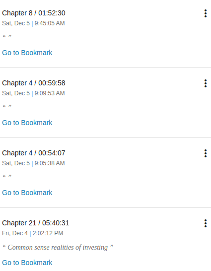 El audio libro como tal está entretenido, sin embargo al ser relacionado a inversiones, hay mucho de porcentajes y gráficas y comparativas que se apoyan en el clásico PDF que viene adjunto con el audio libro, no he encontrado un método eficiente de acceder este tipo de información, ni desde la app de Audible ni desde Web, así que es una de mis criticas mas fuertes a este libro, algo que ya había pasado precisamente con Benjamin Graham, muy buena info, muy bien presentada y muy útil, sin embargo estarse chutando porcentajes y descripciones de gráficas de barras en audio no es para mi gusto, nada intuitivo, por otro lado el libro no es tan largo al rededor de 5 horas y media, y los temas si son mas o menos independientes, por lo tanto habría esperado un mejor indexado de los capítulos, con sus títulos y subtitulos al menos, sin embargo estamos frente a uno de esos casos cuando lo único que obtienes es una listota de capítulos sin nombre que no tienes bien idea de que tema es cada uno, hacer bookmarks también se torna complicado ya que al revisarlas lo único que obtienes es el numero del capitulo y hay que trabajar doble para sacar la información deseada.