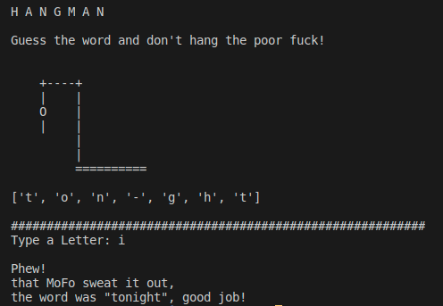 print('Dammit, you killed the poor fuck,\nanyway, the word was: {}'.format(word))