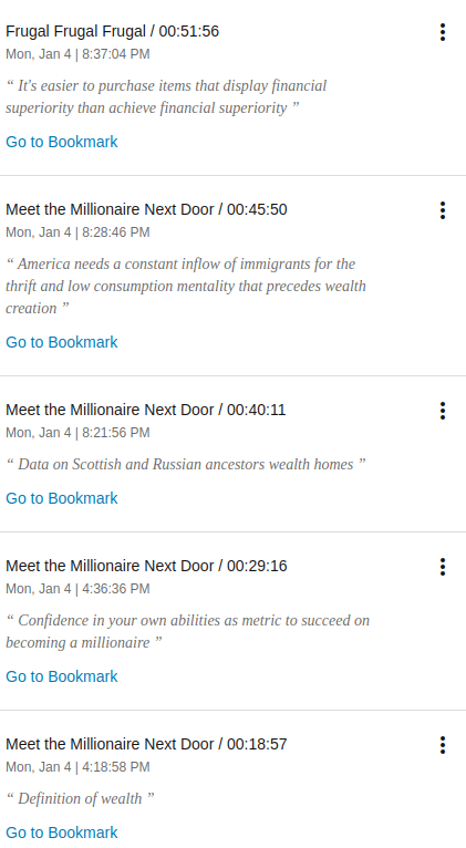 Para cerrar, en si el audio libro viene bien indexado, puedes ver los capítulos, me habría gustado ver sub capítulos, pero bueno no todo se puede en Audible, el narrador hace un buen trabajo, su voz suena casi igual en múltiples velocidades y es bastante clara, es un libro de 8+ horas, así que si requiere algo de tiempito, por ese lado no es tan «ligero«, sin embargo el ritmo del narrador y el estilo con el que lo escribieron los autores, lo hace mucho mas llevadero y te lo puedes chutar mas o menos rápido, si lo recomiendo por que a menos que ya seas «self made millionaire» trae varios tips que puedes aplicar para empezar (o mejorar) a amasar ese billetón, le voy a poner 4/5 ⭐⭐⭐⭐ y acá te dejo la liga en Audible para que te lo escuches: The Millionaire Next Door.