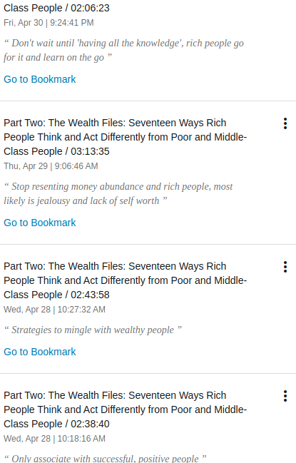 Como conclusión creo que si aporta valor al arsenal, pero si necesita algo de apertura mental, incluye ciertos «rituales» de afirmación que si es la primera vez que te encuentras con algo así, de entrada da risa, y después es sencillo despreciarlos como reacción secundaria, lo recomiendo si ya decidiste a poner orden a tus finanzas y estas dispuesta a tomar acción, sin embargo por el tema del indexado le voy a tener que poner 4/5 ⭐⭐⭐⭐, acá como siempre te dejo la liga para que te lo escuches: Secrets of the Millionaire Mind.
