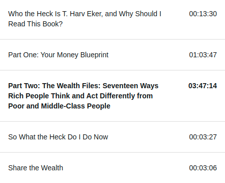Lo considero un audio libro de «mediano pelo» dura 5 horas y un poco mas, así que sigue siendo una lectura ligera, no usan palabras tan rebuscadas, aunque Eker se las ingenia para decir «bullshit» de como cinco modos distintos (o mas, si encuentra más, ponlo en los comentarios) .