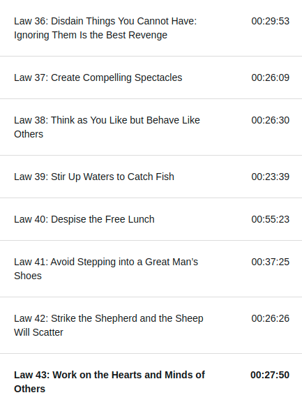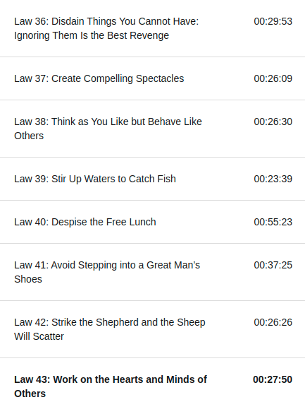 A pesar de sonar como fanboy, le voy a dar un 4/5 ⭐⭐⭐⭐, me hubiera gustado ver una conclusiones o algo, como en otros libros el autor ha incluido, este libro termina de un modo mas o menos abrupto, fuera de eso todo en orden y super satisfecho con la información presentada, como ya dije debido al buen y útil indexado de las leyes no necesité usar las bookmars, y para cerrar aca te dejo la liga para que te lo escuches: 48 Laws of Power.