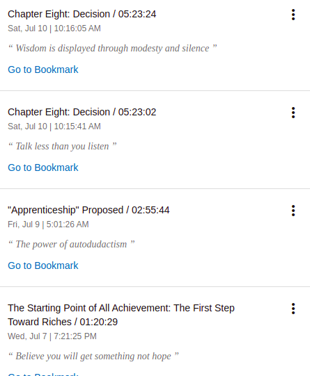 Los principios «filosóficos» están buenos y si tiene partes mas o menos accionables, estrategias y una que otra historia interesante, como cuando el autor describe sus mentorías imaginarias, las cuales consistían en literalmente imaginarse en una habitación llena de personajes que el consideraba como figuras a emular y literalmente preguntarles cosas, fue un ejercicio que de entrada suena medio psicótico pero puedo ver el valor en su practica.