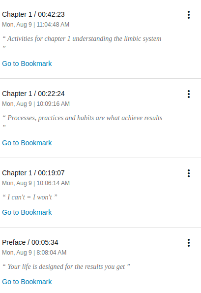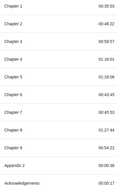 Cada capitulo tiene una estructura básica donde habla del concepto luego da algunos ejemplos y luego cierra con una ronda de preguntas (bastante útiles en muchos casos), sin embargo el audio libro solo tiene una serie de capítulos sin mas información, así que no tienes idea de si estas en el 3ro o el 8vo o cuál es el titulo.