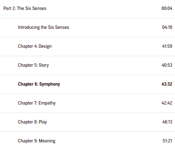 Hubo capítulos muy interesantes con analogías que disfrute mucho como el pensamiento «sinfónico» el cual requiere o involucra «orquestar» múltiples elementos para crear algo nuevo, literal como un compositor puede tejer muchos instrumentos en una sinfonía, me encantó este capítulo.