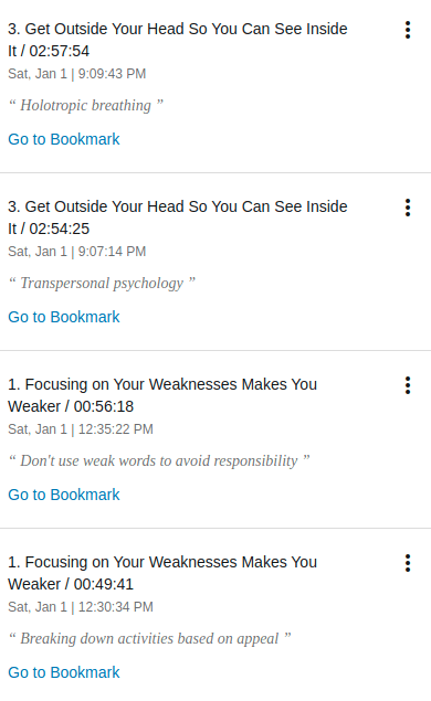 Ayuda bastante que el autor sea el que lee su libro, luego sigue el indexado, el cual esta… bien, sin embargo, a este autor parece que no gusta de ser tan descriptivo en sus capítulos, el libro esta dividido en 3 partes y cada una tiene 5 capítulos, cada capitulo cierra con sugerencias o «puntos de acción» lo cual se me hizo super bueno, lo que no se me hizo super bueno es que no lo separa dentro del capitulo, entonces vas a tener que «escarbarle» al sub capitulo, siento que el libro (como en muchísimos casos) se beneficiaria ampliamente de separar esa parte de conclusión en cada capitulo.